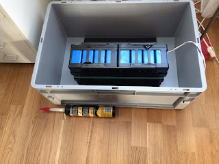 Nästa steg blir provmontering och inredning av lådan på bänk innan montering in i elmopedbilen. Det tog lite tid att provköra batteri, ballansera och färdig koppla på bänk... fortsättning följer!